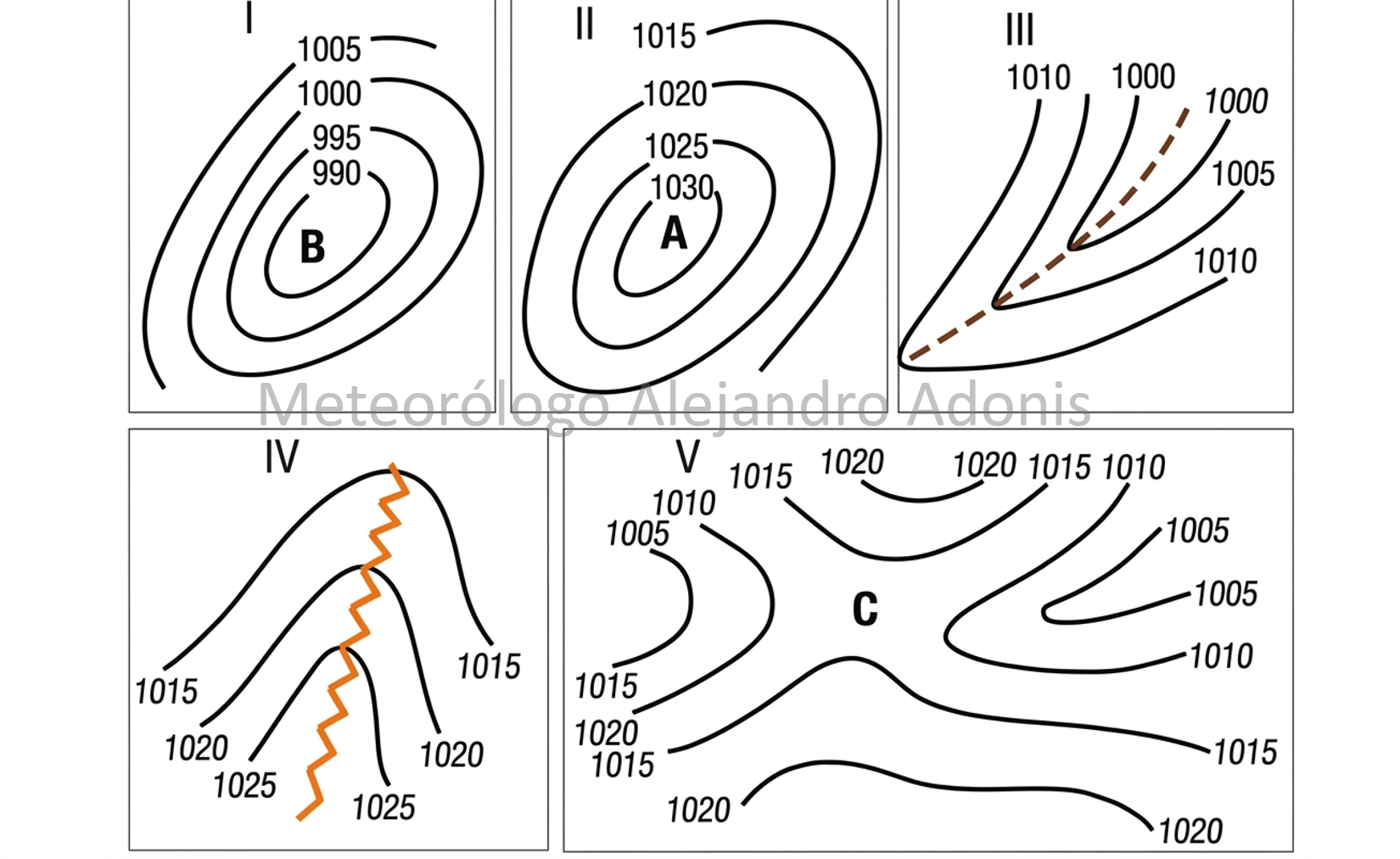 Imagina una superficie isobárica como una hoja de papel, si la plegamos hacia arriba y hacia abajo, cada parte de la superficie quedará a una determinada altura. Las líneas que unen puntos de la misma altura de la superficie isobárica se llaman isohipsas y a esa altura se le llama altura geopotencial. En cualquier nivel de la tropósfera, se le dice "ciclón" de manera genérica a todo sistema que se puede identificar por un valor mínimo central de presión o de geopotencial, según sea el caso, rodeado por isolíneas cerradas, sean isobaras o isohipsas (figura 1, elemento I). Lo mismo aplica para los anticiclones, solo que con un valor de presión o geopotencial máximo en el centro (elemento II de la figura 1).